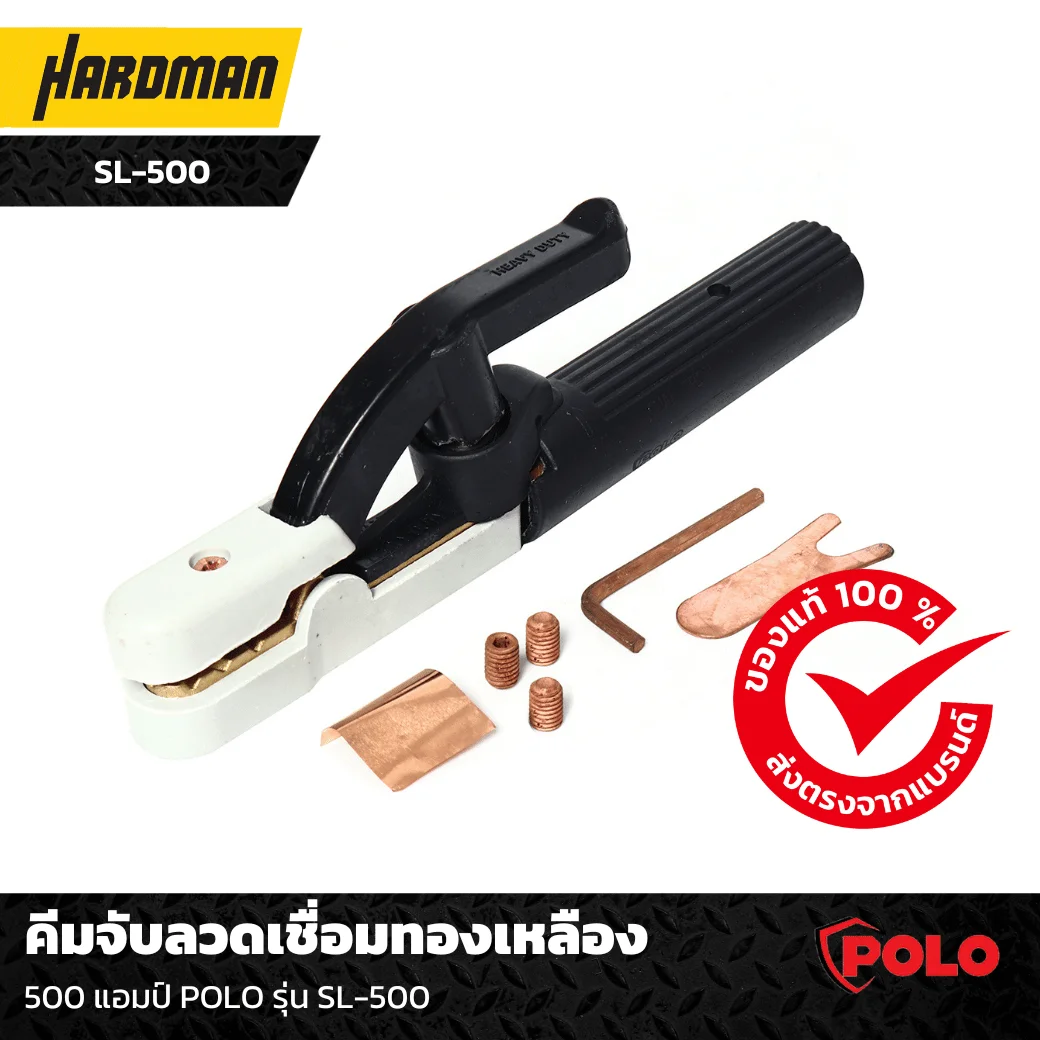 หัวจับลวดเชื่อมแบบแมนนวล เป็นหัวจับลวดเชื่อมที่ทำงานโดยมือ ต้องป้อนลวดเชื่อมด้วยมือ เหมาะสำหรับงานเชื่อมขนาดเล็กหรืองานเชื่อมที่ไม่ต้องการความแม่นยำสูง คีมจับลวดเชื่อมทองเหลือง 500 แอมป์ POLO รุ่น SL-500
