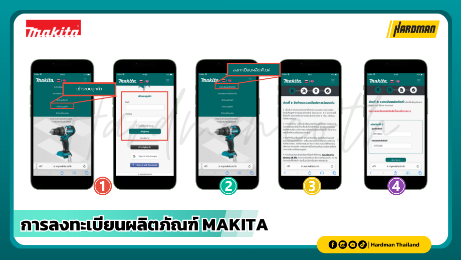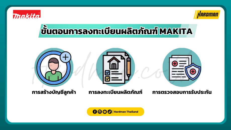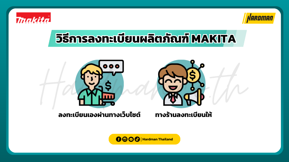 สำหรับบทความนี้ Hardman จะบอกวิธีการลงทะเบียนแบบที่สอง คือ การลงทะเบียนเองผ่านทางเว็บไซต์ Makita Thailand ซึ่งต้องใช้ใบเสร็จหรือใบกำกับภาษี และรูปผลิตภัณฑ์ที่เห็นรหัสผลิตภัณฑ์ (SN) เพื่อยืนยันการลงทะเบียน โดยมีขั้นตอนการลงทะเบียนผลิตภัณฑ์มากีต้าเป็น 3 ขั้นตอน คือ 1. การสร้างบัญชีลูกค้า 2. การลงทะเบียนผลิตภัณฑ์ และ 3. การตรวจสอบการรับประกัน