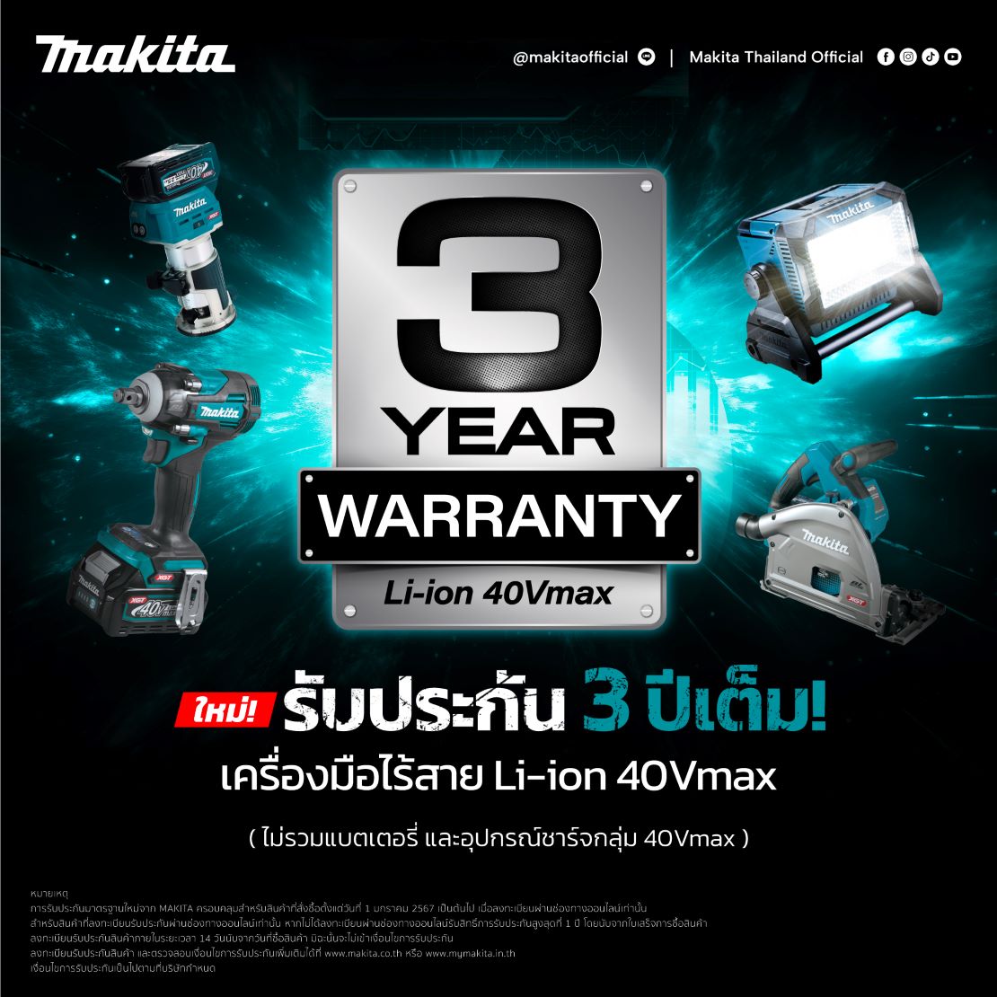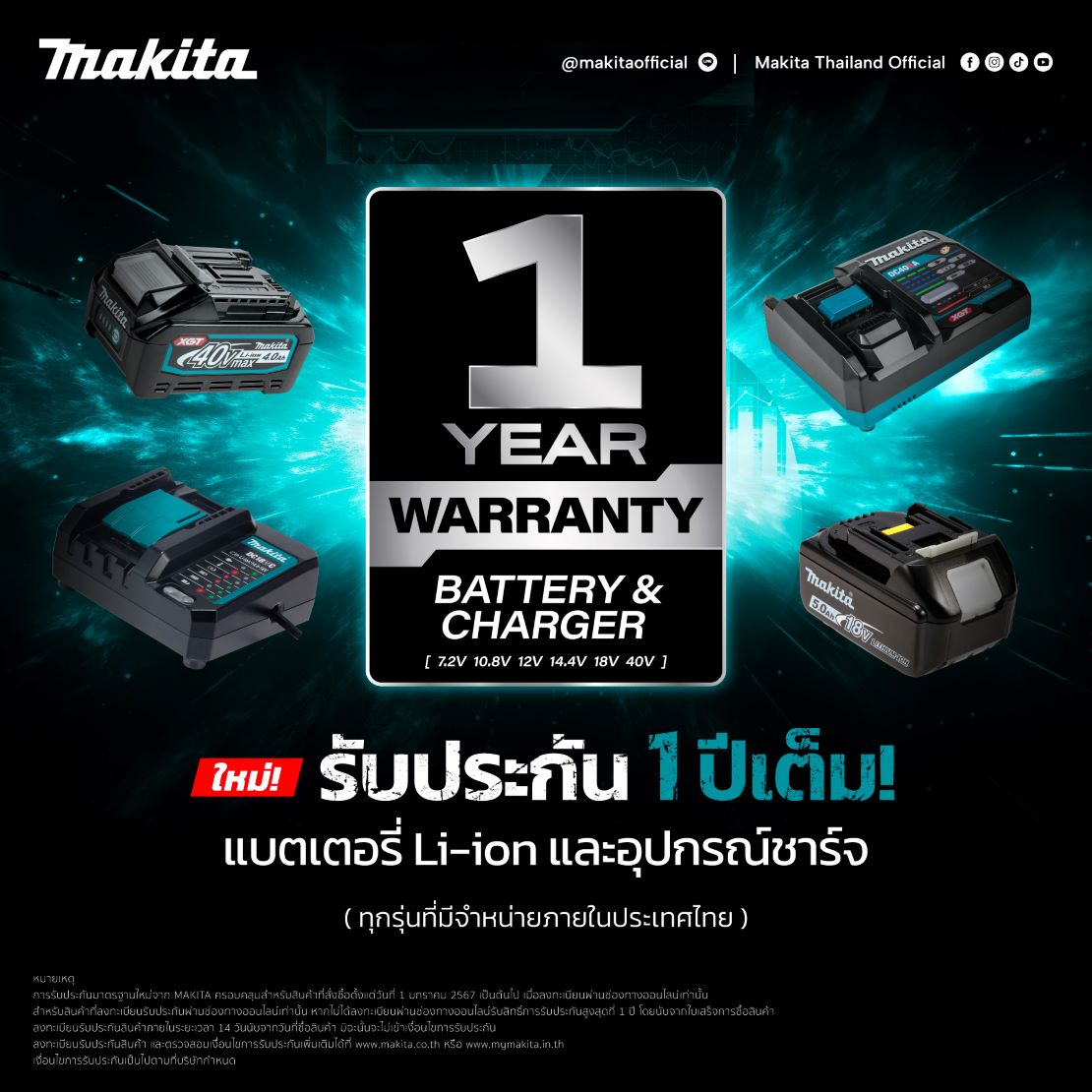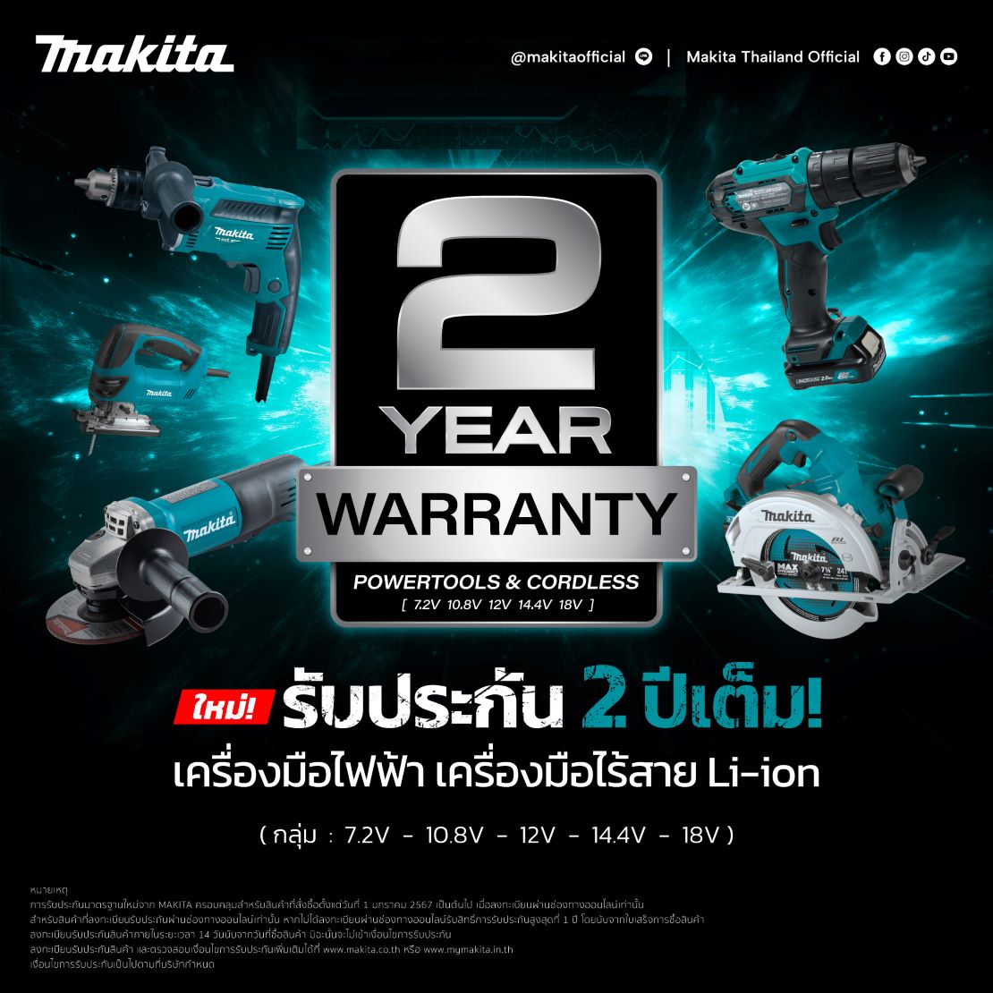 1. รับประกัน 2 ปี ในกรณีที่เกิดความบกพร่องจากการผลิต ต้องทำการลงทะเบียนรับประกันผ่านช่องทางออนไลน์ จึงจะได้รับสิทธิการรับประกันเพิ่มอีก 1 ปี ทั้งหมดเป็น 2 ปี ในกลุ่มเครื่องมือไร้สาย และกลุ่มเครื่องมือไฟฟ้าของมากีต้า
