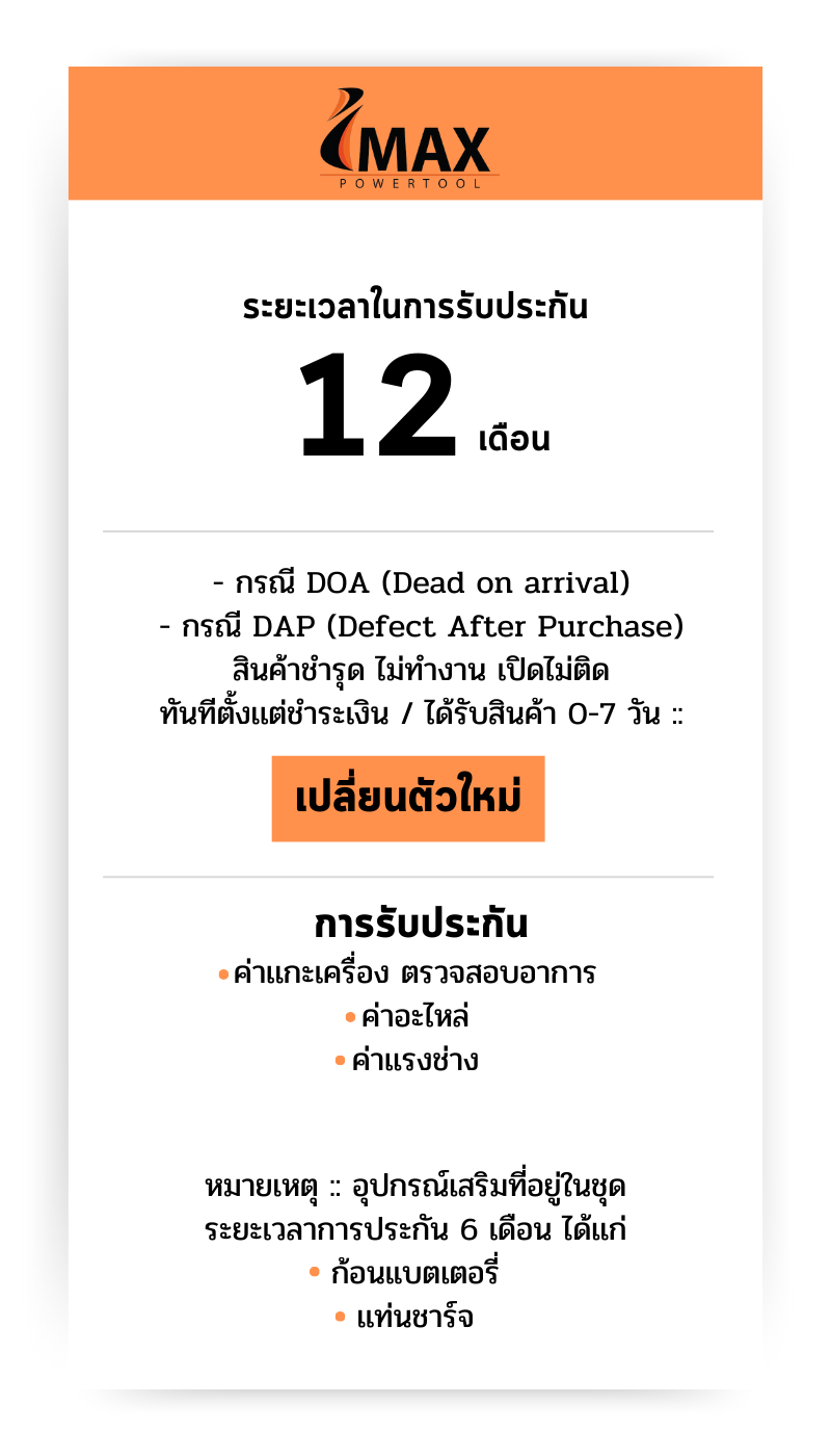 • บริษัทฯ ขอสงวนสิทธิ์การเปลี่ยนแปลงเงื่อนไขการรับประกัน ระยะเวลาการรับประกัน หรือยกเลิกการรับประกันโดยไม่จำเป็นต้องแจ้งให้ทราบล่วงหน้า