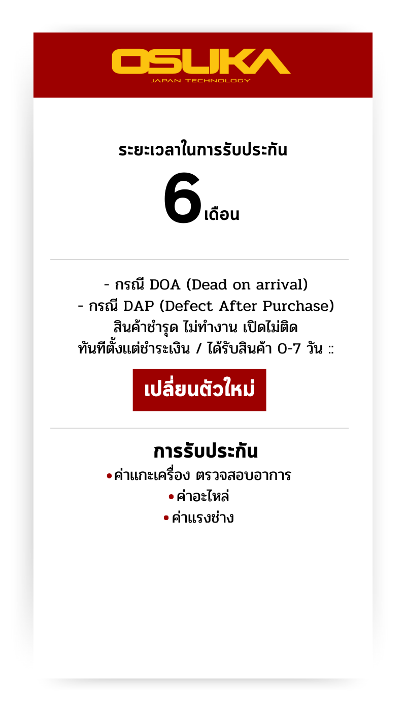 3. สินค้าภายใต้แบรนด์ IMAX เเละ OSUKA จะได้รับประกันคุณภาพผลิตภัณฑ์เป็นระยะเวลา 1 ปี เเละ 6 เดือน ตามลำดับอัตโนมัติ หลังจากการกรอกข้อมูลเสร็จ
