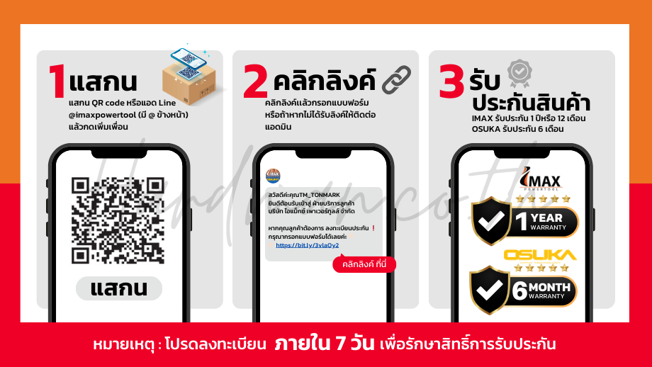 สำหรับการลงทะเบียนรับประกันสินค้าภายใต้แบรนด์ IMAX เเละ OSUKA มีการรับประกันคุณภาพผลิตภัณฑ์เป็นระยะเวลา 1 ปี เเละ 6 เดือน ตามลำดับ โดยลูกค้าจะต้องทำการลงทะเบียนผลิตภัณฑ์ที่ซื้อให้เรียบร้อยภายในระยะเวลา 7 วัน นับจากวันที่ระบุในใบเสร็จรับเงิน หรือวันรับสินค้าที่ระบุบนหลักฐานการซื้อ - ขาย  ซึ่งจะมีการลงทะเบียนสินค้าเพียง 2 ขั้นตอนดังนี้