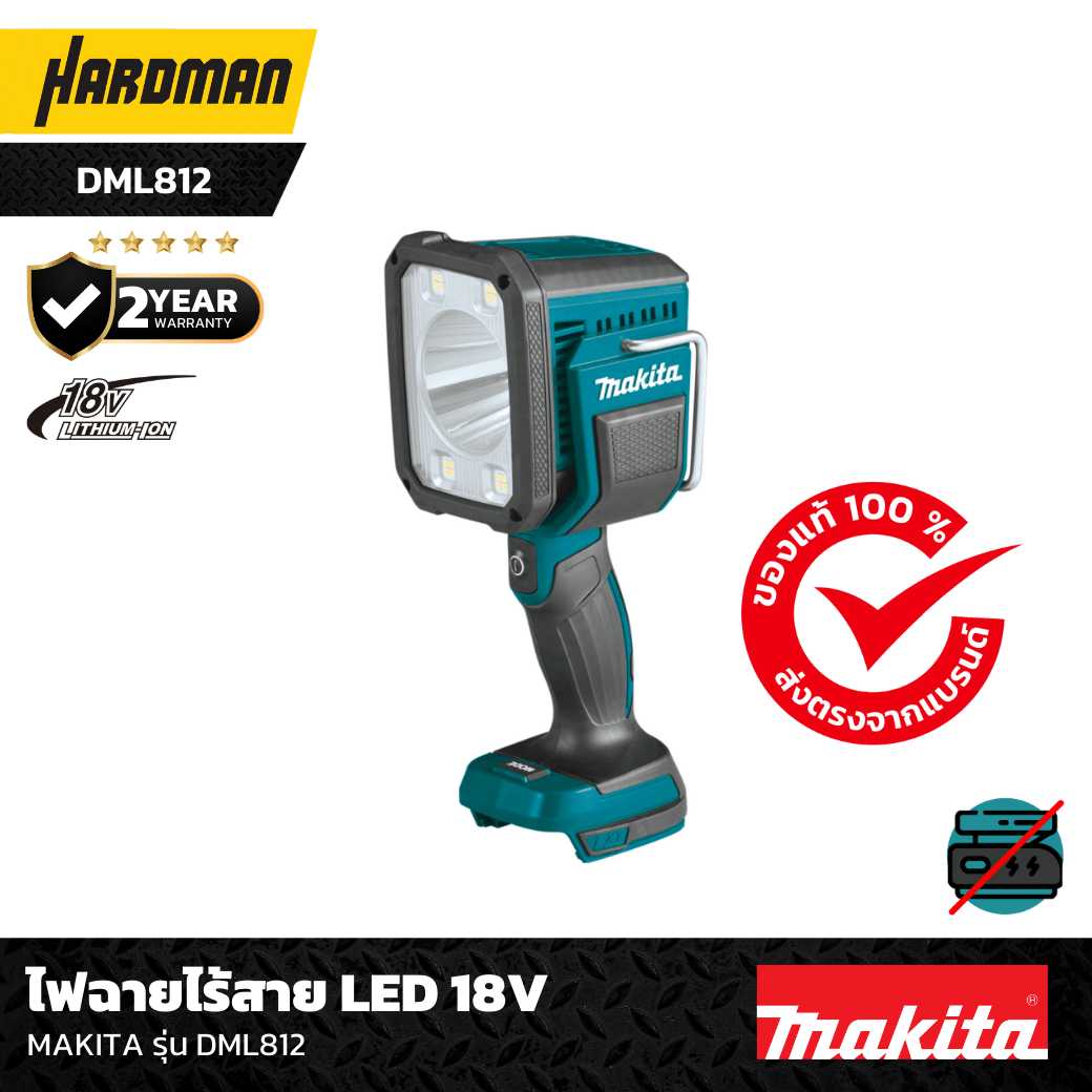 เริ่มกันรุ่นพี่ใหญ่ของเราอย่าง DML812ที่ออกแบบ ตามหลักสรีรศาสตร์มีความสูงเพียง 12-3 / 8 ตัวไฟฉายสามารถส่องสว่างได้ไกลถึง 640เมตร และสามารถสว่างต่อเนื่องนานสูงสุด 7 ชั่วโมงในโหมด Spot เมื่อใช้พร้อมแบตเตอรี่ 5.0Ah 18V LXT® หัวหมุนได้ 90องศา สามารถปรับได้สะดวก ไฟฉายมีความสว่างถึง1,250 ลูเมน ไฟสามารถปรับได้3ระดับเพื่อให้เหมาะกับการใช้งาน น้ำหนักแค่ 1.2 กิโลกรัม พกพาไปไหนก็ได้สะดวกสบาย ไฟฉายใช้ได้กับแตเตอรี่ รุ่น BL1830B / BL1850B / BL1860B / BL1815N
