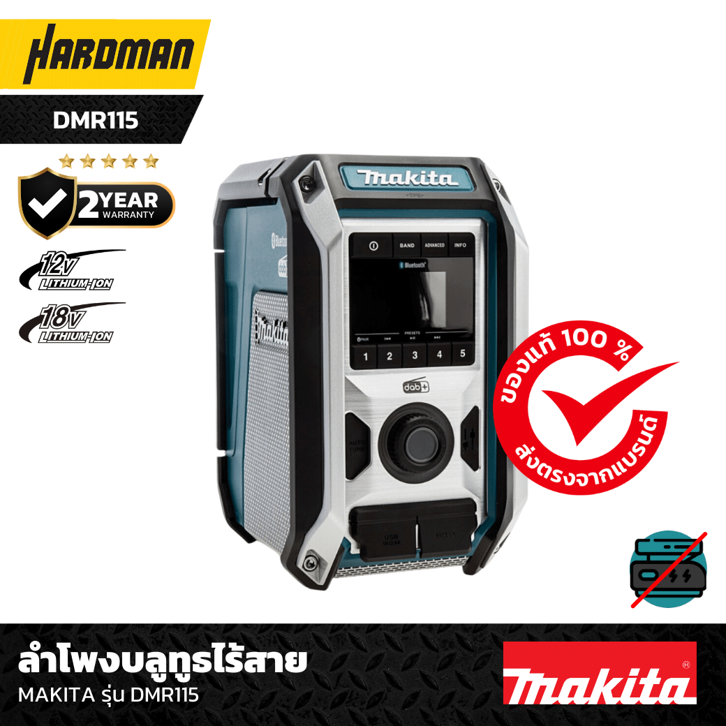 พร้อม Bluetooth 5.0 มี DAB, DAB+ และเหมาะสำหรับ FM เชื่อมต่อ Aux สำหรับการใช้งานร่วมกับ MP3 และการเชื่อมต่อ USB เพื่อชาร์จอุปกรณ์พกพาของคุณ ใช้งานได้กับแบตเตอรี่ Makita Li-Ion แบบสไลด์ออน 10.8 - 18 V แต่ไม่ใช่กับแบตเตอรี่ maktec หรือ G series มีชุดไฟสำหรับจ่ายไฟแบบถาวร (ไม่มีไว้สำหรับชาร์จแบตเตอรี่) พร้อมระบบป้องกันน้ำกระเซ็นถึงระดับการป้องกัน IP65 ขนาดลำโพง Sides: Dia. : 63.5 มม. X2 Bottom: Dia. : 101.6 มม.