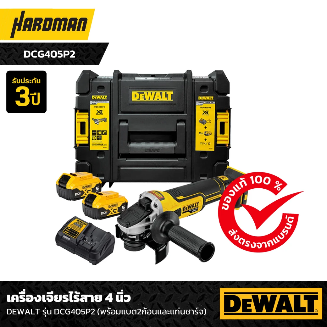 มาถึงอีกรุ่นที่คนนิยมใช้กันอยู่ก็คือ DCG405P2 ที่มาพร้อมแบตเตอรรี่และแท่นชาร์จมาพร้อมใช้งานเลยแถมยังได้กล่อง TSTAK  อีกด้วย ในชุดประกอบไปด้วยเครื่องเจียรไร้สาย แบตเตอรี่ 5.0Ah 2 ก้อน และแท่นชาร์จ มอเตอร์ไร้แปรงถ่าน กำลังแรงเทียบเท่าเครื่องเจียรแบบมีสาย 1000W สวิทช์แบบเลื่อนข้าง มีระบบความปลอดภัยเมื่อเกิดการสะดุด ตัดการทำงานภายใน 1/10 วินาที ความเร็วรอบ 9,000 รอบ/นาที พร้อมประกัน3ปีเหมือนเฉพาะตัวเครื่อง แบตเตอรี่และแท่นชาร์จ 1 ปี