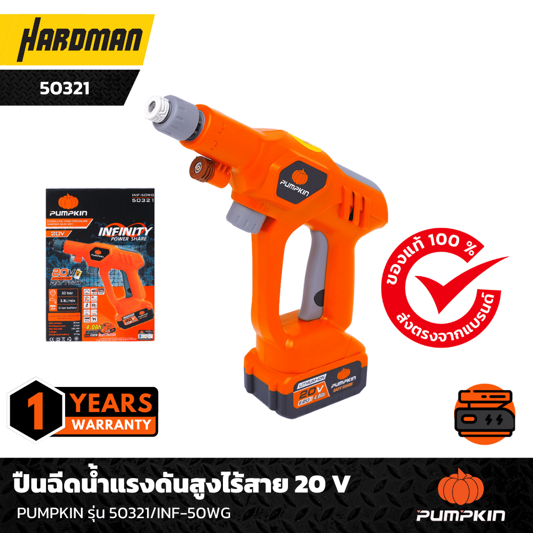 5.ปืนฉีดน้ำแรงดันสูงไร้สาย 20 V PUMPKIN รุ่น 50321/INF-50WG