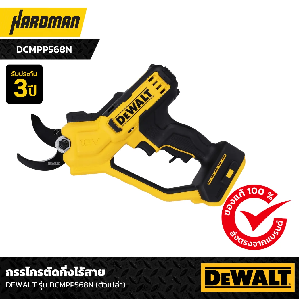 สามารถตัดกิ่งไม้ขนาด 38 มม. มี safety switch ป้องกันอันตรายในการใช้งาน รองรับแบตเตอรี่ 18V ของ DEWALT (ไม่รวมในชุด)