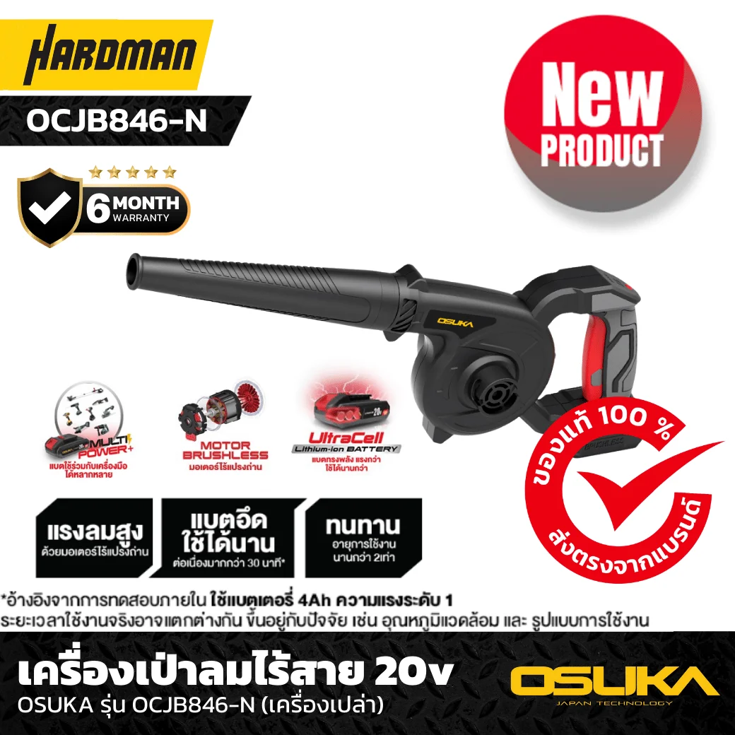 รุ่นแรกมาเริ่มกันกับ osuka ที่กำลังมาแรงเลยนะครับ ตัวเครื่องมากับ ด้วยมอเตอร์ไร้แปรงถ่าน Osuka ใช้งานต่อเนื่องได้นานประมาณ 30นาที เมื่อใช้แบต 4.0Ah ที่ระดับความแรง เบอร์1 Turbo Power แรงลมสูง เสร็จงานไว ใช้งานต่อการชาร์ตได้นานขึ้น