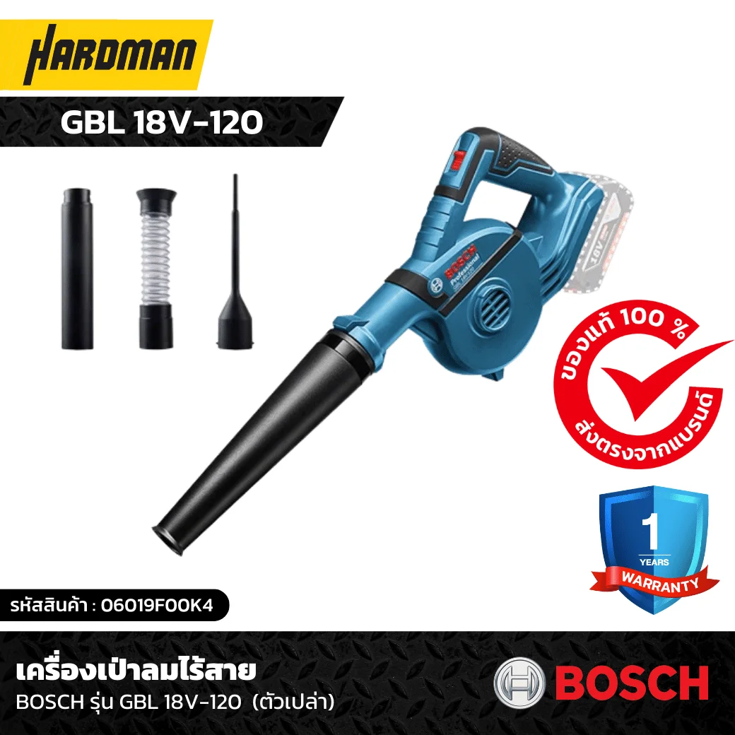 รองรับแบตเตอรี่ Bosch 18V ทุกรุ่น เหมาะสำหรับการเป่าใบไม้ที่มีพื้นที่พอสมควรใช้งานได้ยาวนานขึ้นอยู่กับแบตเตอรี่ที่ลูกค้าใช้งานใน ตัวเครื่องปล่าวมีราคาอยู่ที่ 5950 เท่านั้น พร้อมประกัน 1 ปี