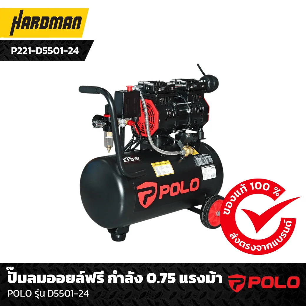 ตัวเอกในงานคงหนีไม่พ้นปั๊มลมออยล์ฟรี กำลัง 0.75 แรงม้า POLO รุ่น D5501-24