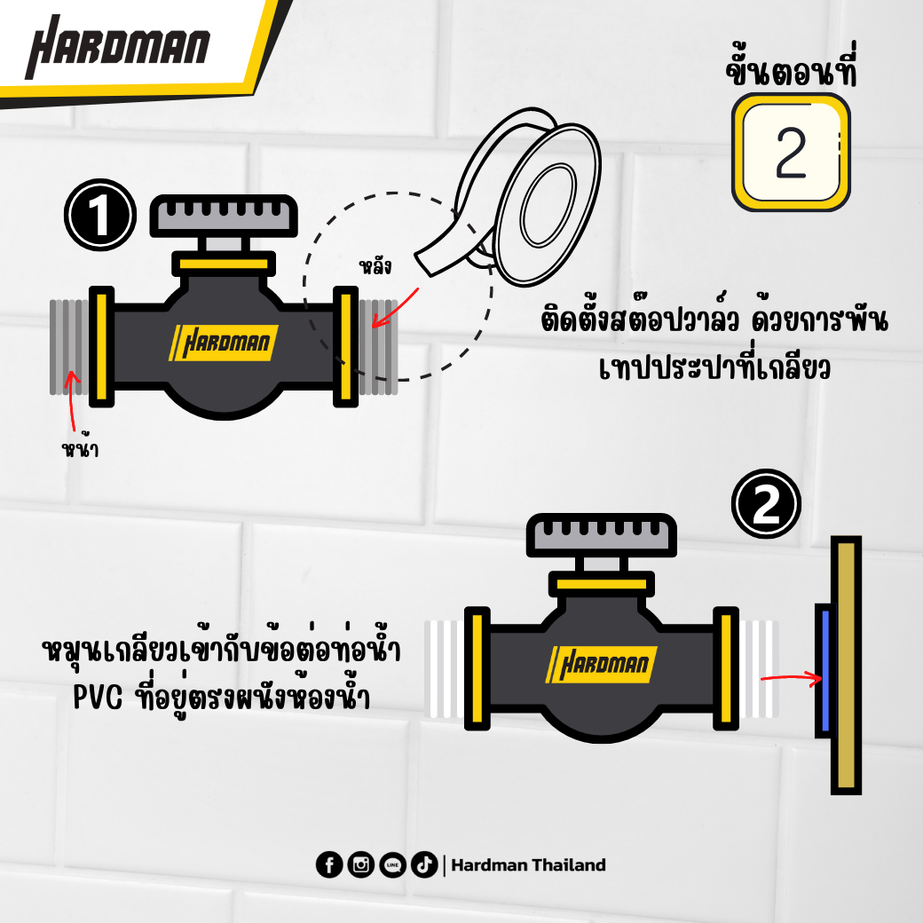 2. ติดตั้งสต๊อปวาล์ว ด้วยการพันเทปประปาที่เกลียวหน้าและหลังสต๊อปวาล์ว จากนั้นให้หมุนเกลียวเข้ากับข้อต่อท่อน้ำ PVC ที่อยู่ตรงผนังห้องน้ำ