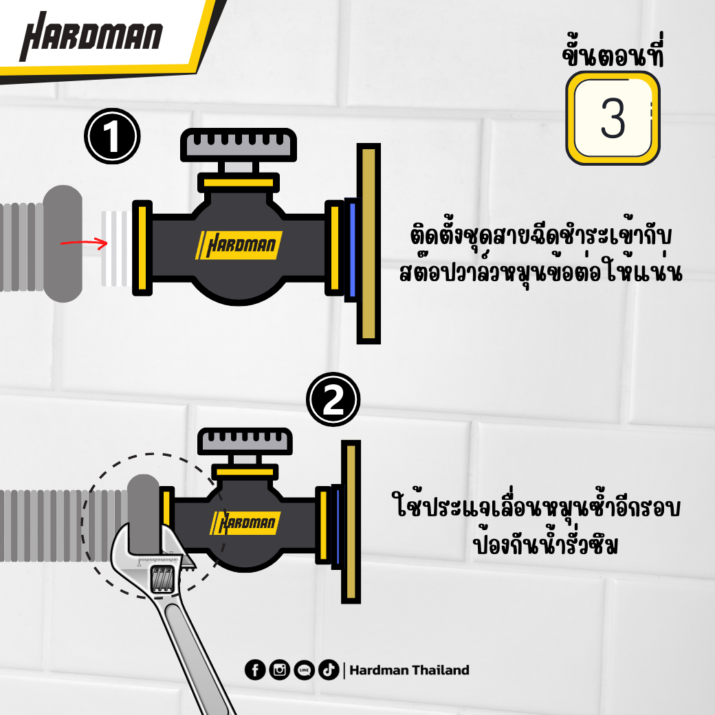 3. ติดตั้งชุดสายฉีดชำระเข้ากับสต๊อปวาล์ว หมุนข้อต่อให้แน่น ป้องกันน้ำรั่วซึม จากนั้นให้ใช้ประแจคอม้าหมุนซ้ำอีกรอบ แล้วใช้ผ้าเช็ดตามข้อต่อต่างๆ ให้แห้งสนิท