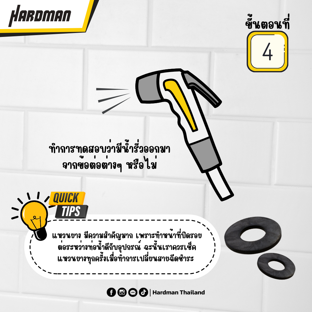 Tip : แหวนยาง มีความสำคัญมาก เพราะทำหน้าที่ปิดรอยต่อระหว่างท่อน้ำดีกับอุปกรณ์ ฉะนั้นเราควรเช็คแหวนยางทุกครั้งเมื่อทำการเปลี่ยนสายฉีดชำระ ว่าอยู่ในสภาพที่พร้อมใช้งานหรือไม่? เพื่อป้องกันการรั่วซึมของสายฉีดชำระ