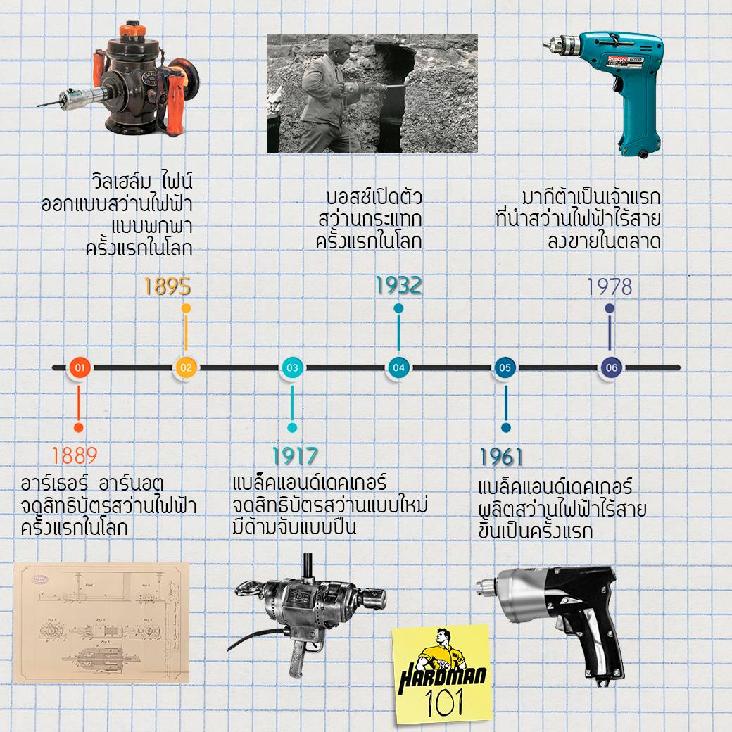 นี่เป็นไทม์ไลน์ของพาวเวอร์ทูลส์แบบกระชับ เพื่อนๆ จะเห็นว่าพัฒนาการของมันเพิ่งมีมา 134 ปีนับจากสิทธิบัตรฉบับแรกของอาเธอร์ อาร์นอต
