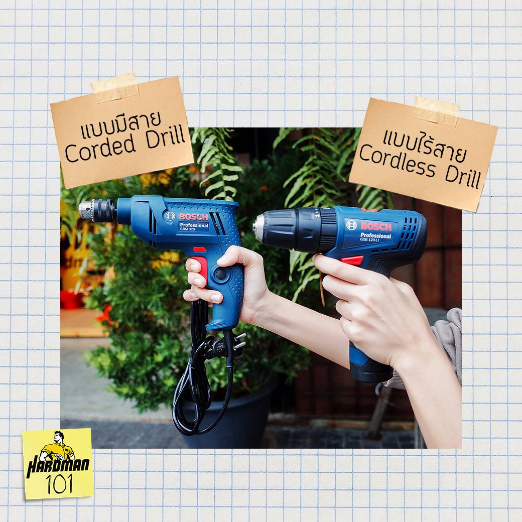 1.แบบใช้ไฟบ้าน หรือแบบมีสาย (Corded Drill) ใช้งานได้ต่อเนื่อง ยาวนาน