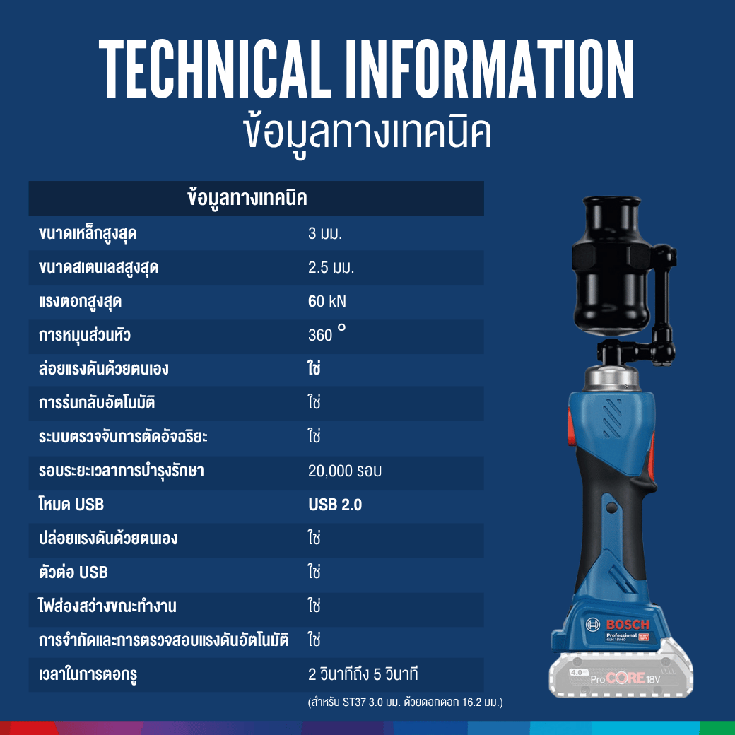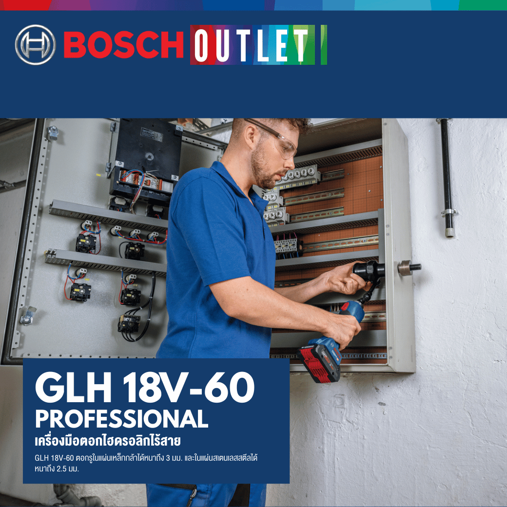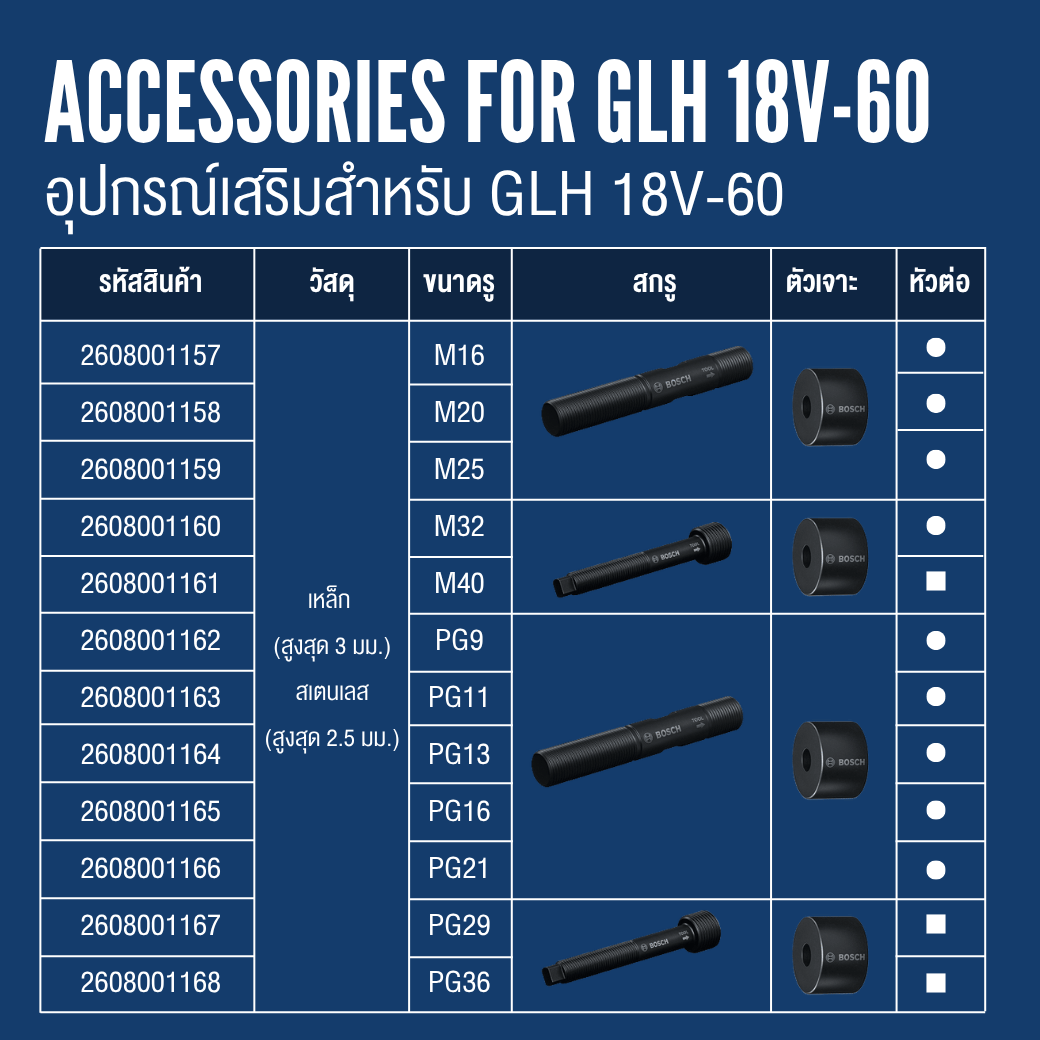 The GLH 18V-60 punches holes in steel sheets up to 3 mm thick and in stainless-steel sheets up to 2.5 mm. Bosch offers accessories from M16 - M40 and PG9 - PG36 all of which are suitable for both steel and stainless steel. The USB connection and read-out software (free and available to download below) lets you easily monitor the tools punching history, error messages and maintenance.