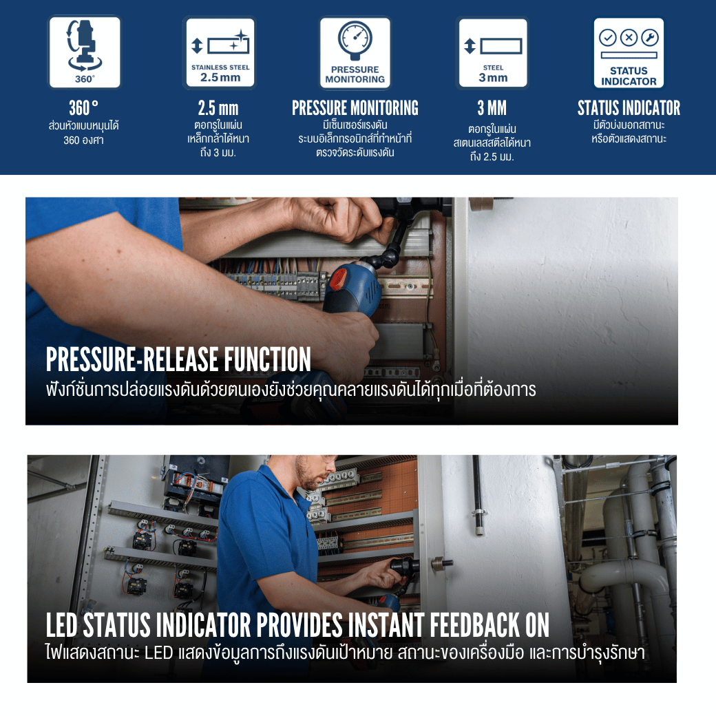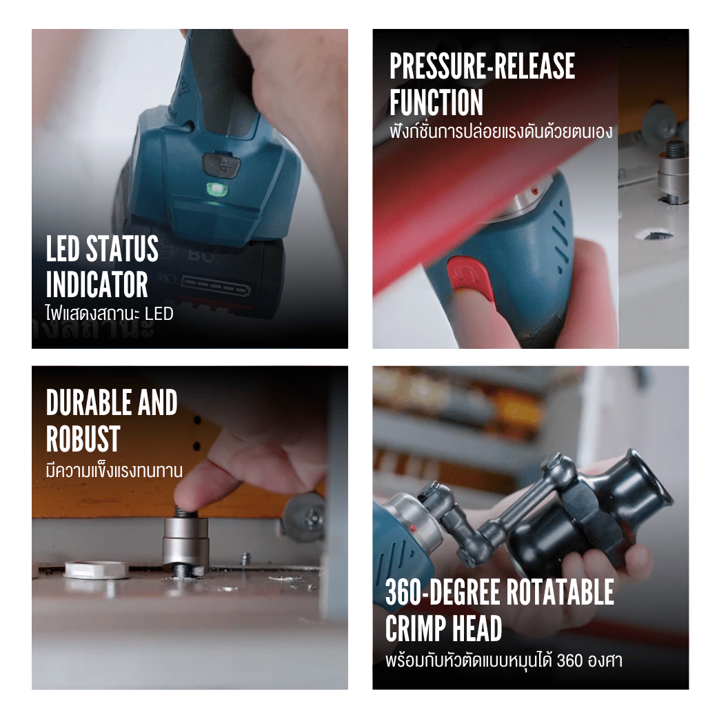 - High performance with reliable output force of 60kN maximum, thanks to electronic pressure monitoring