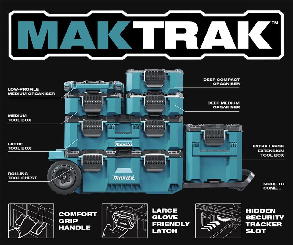 The Makita MAKTRAK™ is the Next Generation in Modular Storage Systems. MAKTRAK™ is designed, engineered with global materials and built on four core functions: Transportation, Access, Storage and Organisation. Each function of the MAKTRAK™ system is driven by innovative design and precision engineering, making it the most advanced solution available. With features that streamline access, enhance loading and unloading into the back of a van, and more, MAKTRAK™ sets a new standard for the category.