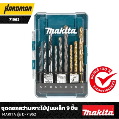 ชุดดอกสว่านเจาะไม้ปูนเหล็ก 9 ชิ้น MAKITA รุ่น D-71962 เป็นชุดดอกสว่านคุณภาพสูงจากแบรนด์ MAKITA เหมาะสำหรับงานเจาะไม้ ปูน และเหล็กทั่วไป
