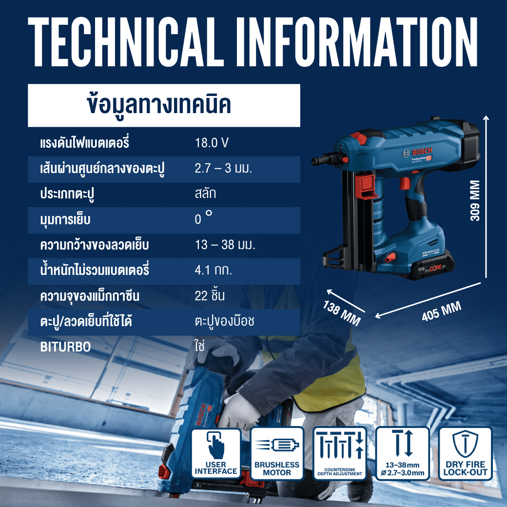 เครื่องยิงตะปูในไม้รุ่น GNH 18V-35 เป็นระบบเครื่องมือไร้สายสำหรับการยึดติดที่แม่นยำ ช่วยให้ชิ้นงานของคุณไม่มีรอย เนื่องด้วยแรงดีดกลับที่ลดลงและปลอกกันรอยที่มีผิวสัมผัสต่างกันสำหรับการใช้งานในรูปแบบต่างๆ มอบผลลัพธ์การทำงานที่สมบูรณ์แบบแม้ในมุมทำงานที่ยากลำบากด้วยระบบนำเจาะและยิงตะปู/หมุดที่แม่นยำ คุณสามารถยิงตะปู/หมุดให้จมได้อย่างสม่ำเสมอด้วยกำลังเต็มที่จากมอเตอร์ไร้แปรงถ่านและระบบคอยล์สปริงที่เปี่ยมประสิทธิภาพ มั่นใจได้ว่าชิ้นงานของคุณได้รับการปกป้องจากความเสียหายด้วยระบบล็อคการยิงเมื่อไม่มีลูก ซึ่งจะป้องกันไม่ให้มีการยิงตะปู/หมุดเมื่อแม็กกาซีนว่างเปล่า ยิ่งไปกว่านั้น ยังสามารถตั้งค่าความลึกได้เร็วและง่ายดายด้วยคุณสมบัติการปรับความลึกแบบต่อเนื่องของเครื่องมือ