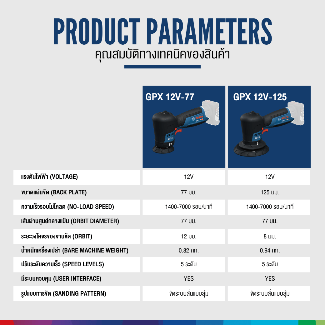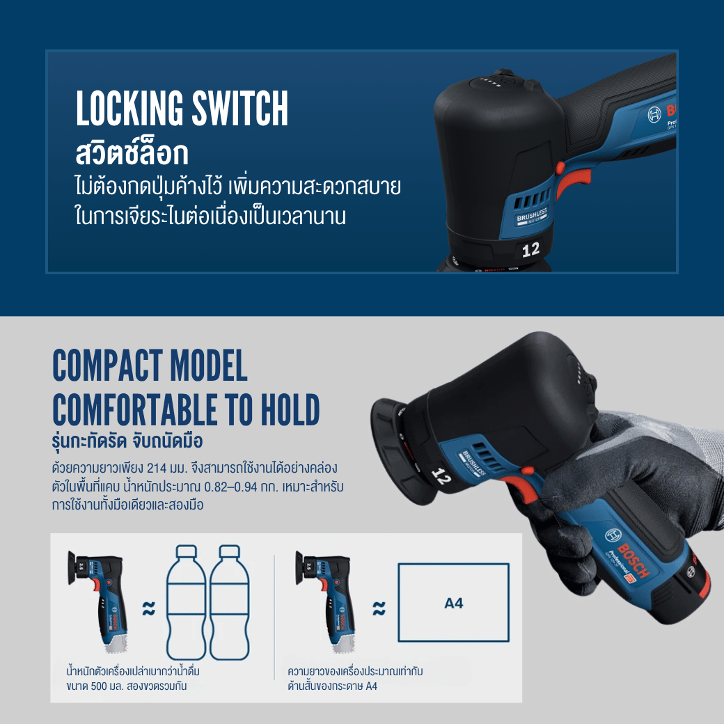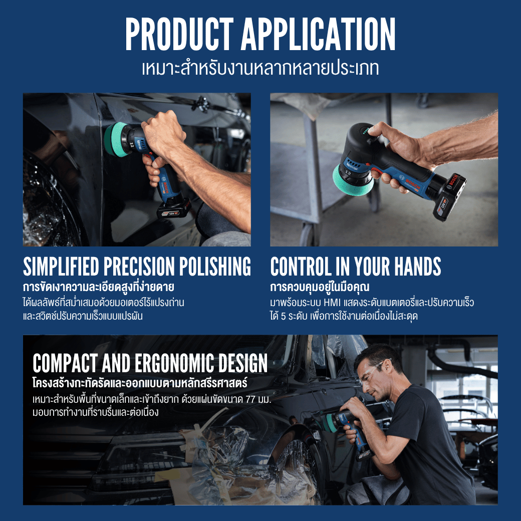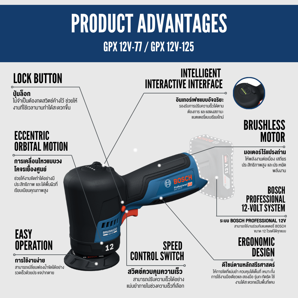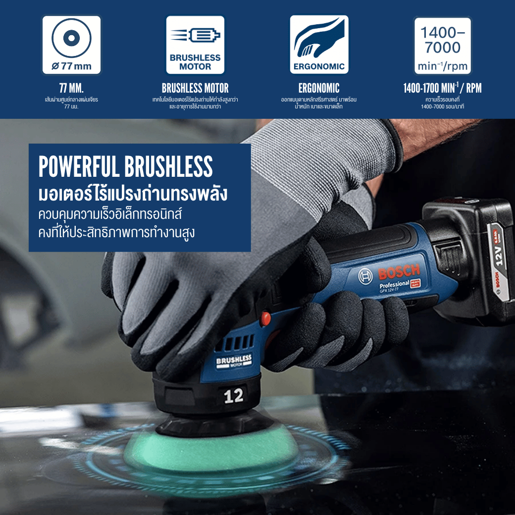 เครื่องขัดระบบสั่นแบบสุ่มรุ่น GPX 12V-77 ให้ประสิทธิภาพที่สม่ำเสมอด้วยมอเตอร์ไร้แปรงถ่าน ผสานรวมความสะดวกสบายและความแม่นยำเข้ากับสวิตช์ปรับความเร็วเพื่อให้ได้ความละเอียดในระดับที่ต้องการและระบบเริ่มการทำงานอย่างนุ่มนวลเพื่อป้องกันการกระเด็น ฟังก์ชั่น HMI ของเครื่องขัดรุ่นนี้มาพร้อมไฟแสดงสถานะการชาร์จแบตเตอรี่และฟังก์ชั่นปรับเลือกความเร็ว 5 ระดับ ช่วยให้คุณควบคุมกระบวนการขัดเงาได้อย่างง่ายดาย GPX 12V-77 ช่วยลดความเมื่อยล้าในการขัดเงาด้วยปุ่มล็อคที่จะทำหน้าที่กดสวิตช์ความเร็วค้างไว้ขณะที่คุณทำงาน ขนาดกะทัดรัดและออกแบบตามหลักสรีรศาสตร์ ช่วยเพิ่มความสะดวกสบายและใช้งานง่าย