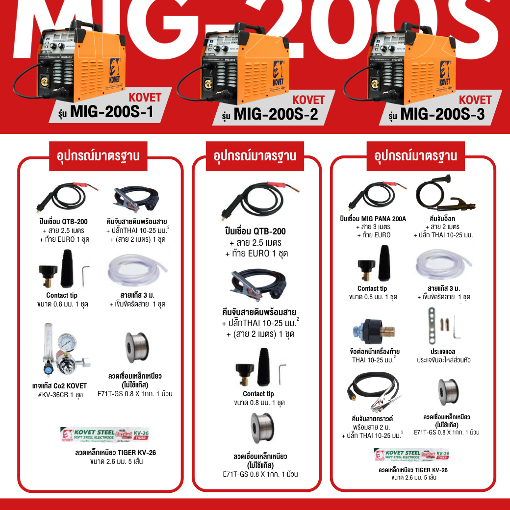 คุณสมบัติของเครื่องเชื่อมไฟฟ้า 3 ระบบ 160A (MIG/MAG, MMA, Lift TIG) KOVET รุ่น MIG-200S