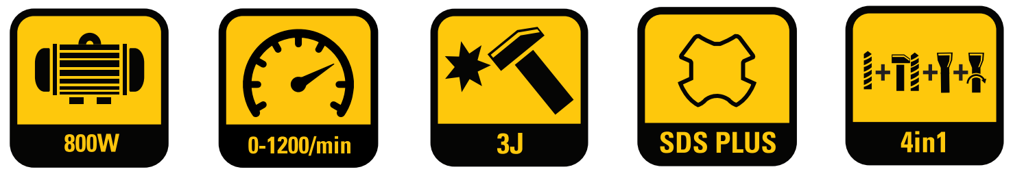 - กำลังไฟ 800 วัตต์ ให้พลังงานที่เพียงพอสำหรับงานเจาะคอนกรีต และวัสดุแข็ง