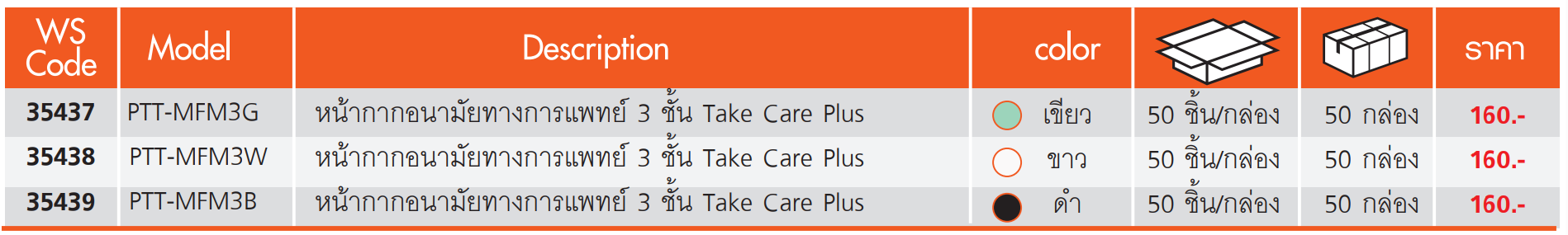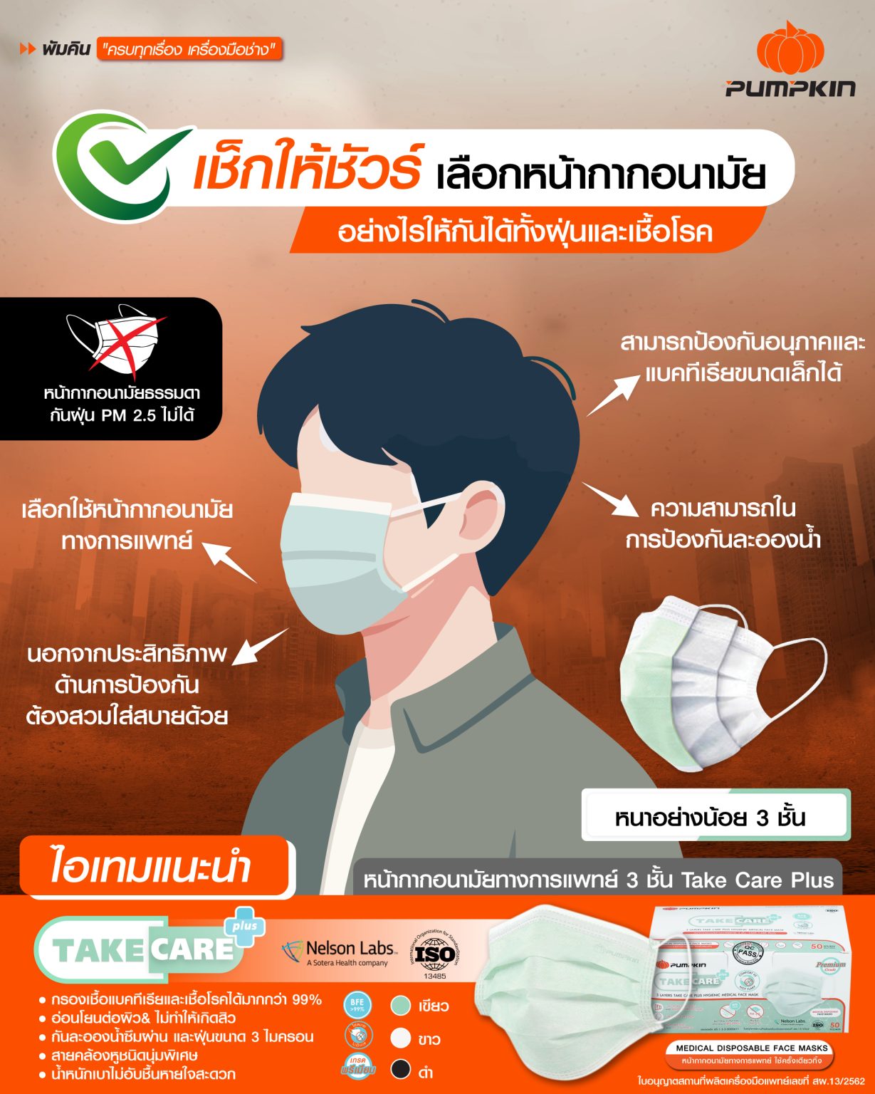 คุณสมบัติของหน้ากากอนามัยทางการแพทย์ 3 ชั้น Take Care Plus PUMPKIN