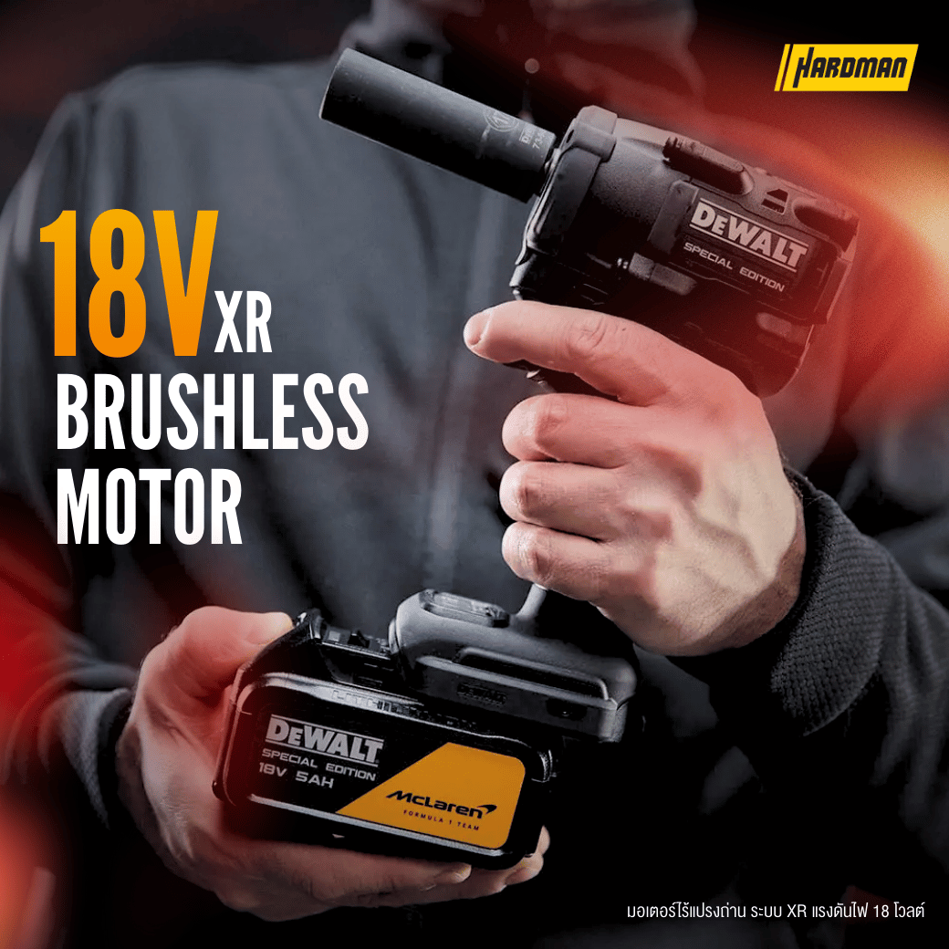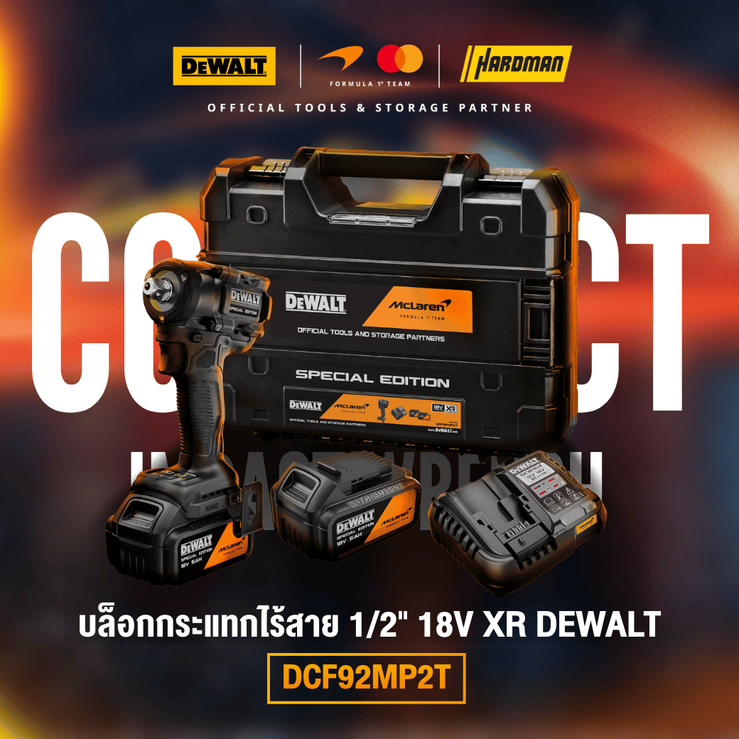 ชุดประแจกระแทกไร้สายขนาดกะทัดรัด 1/2 นิ้ว DeWalt DCF92MP2T-XE DeWalt x McLaren F1 Team 18V XR 5.0Ah Li-ion - รุ่นพิเศษ ซึ่งความเป็นเลิศทางวิศวกรรมมาบรรจบกับนวัตกรรมล้ำสมัย เครื่องมือรุ่นพิเศษนี้ผสมผสานความทนทานเข้ากับเทคโนโลยีล้ำสมัย ไม่ว่าคุณจะอยู่ในพิตหรือในสถานที่ทำงาน สัมผัสพลังและความแม่นยำที่แชมเปี้ยนไว้วางใจ