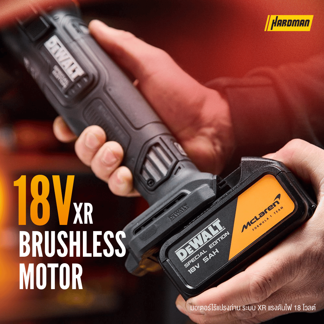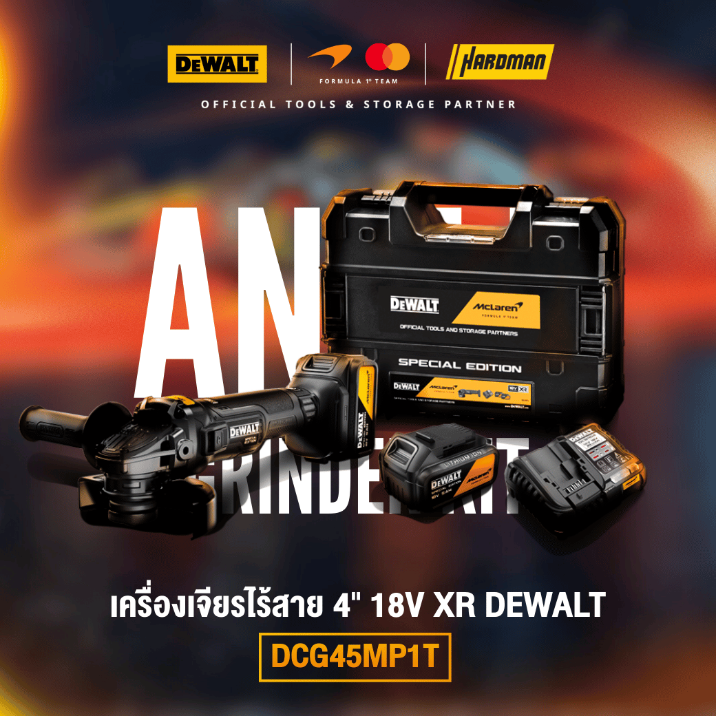ขอแนะนำ เครื่องเจียร 18V XR รุ่นพิเศษ DEWALT x McLaren F1 Team ที่ผสานความเป็นเลิศด้านวิศวกรรมเข้ากับนวัตกรรมระดับสนามแข่งอย่างลงตัว เครื่องมือเอดิชันพิเศษนี้รวมความทนทานเข้ากับเทคโนโลยีล้ำสมัย ไม่ว่าคุณจะอยู่ในพิทหรือในไซต์งาน ก็สามารถสัมผัสพลังและความแม่นยำในแบบที่แชมป์ตัวจริงเลือกใช้จาก DEWALT และ McLaren F1 Team ได้อย่างเต็มที่ ขับเคลื่อนประสิทธิภาพด้วย มอเตอร์ไร้แปรงถ่านทรงพลัง ให้ความเร็วรอบสูงสุดถึง 9,000 รอบต่อนาที ออกแบบมาสำหรับผู้ที่ต้องการความเร็วและประสิทธิภาพในทุกงานตัดและงานเจียร ระบบ Electronic Clutch และ Kickback Brake ทำงานร่วมกันเพื่อลดแรงสะบัด และหยุดแผ่นเจียรได้อย่างรวดเร็วและปลอดภัย ช่วยให้คุณควบคุมเครื่องได้มั่นใจ แม้ต้องทำงานภายใต้แรงกดดัน ความแม่นยำและนวัตกรรมถูกใส่มาในทุกรายละเอียด ฝาครอบตาข่าย (Mesh Covers) ช่วยปกป้องมอเตอร์จากฝุ่น ยืดอายุการใช้งานและลดเวลาหยุดซ่อม ระบบ Soft Start ช่วยให้การเริ่มทำงานนุ่มนวล ควบคุมได้ดี ไม่มีสะดุด มีแต่พลังล้วน ๆ ด้ามจับยาง Rubber Overmould และด้ามจับเสริมด้านข้างปรับได้ 2 ตำแหน่ง เพิ่มความกระชับและความสบาย ให้คุณพร้อมลุยงานหนักได้อย่างคล่องตัวและควบคุมได้ดั่งทีมแข่งระดับโลก