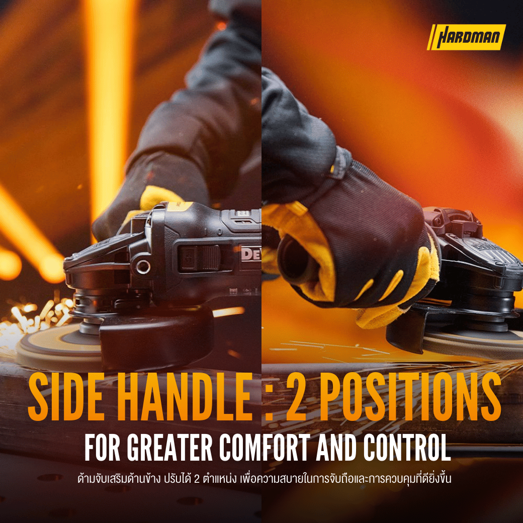 - ด้ามจับเสริมด้านข้าง ปรับได้ 2 ตำแหน่ง รองรับทั้งถนัดซ้ายและขวา พร้อมควบคุมมุมตัดได้ดียิ่งขึ้น