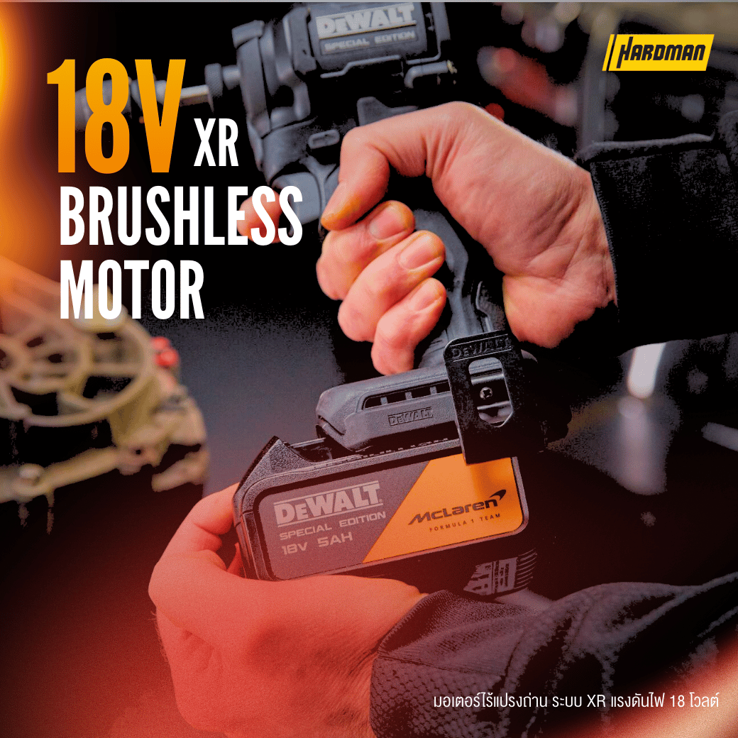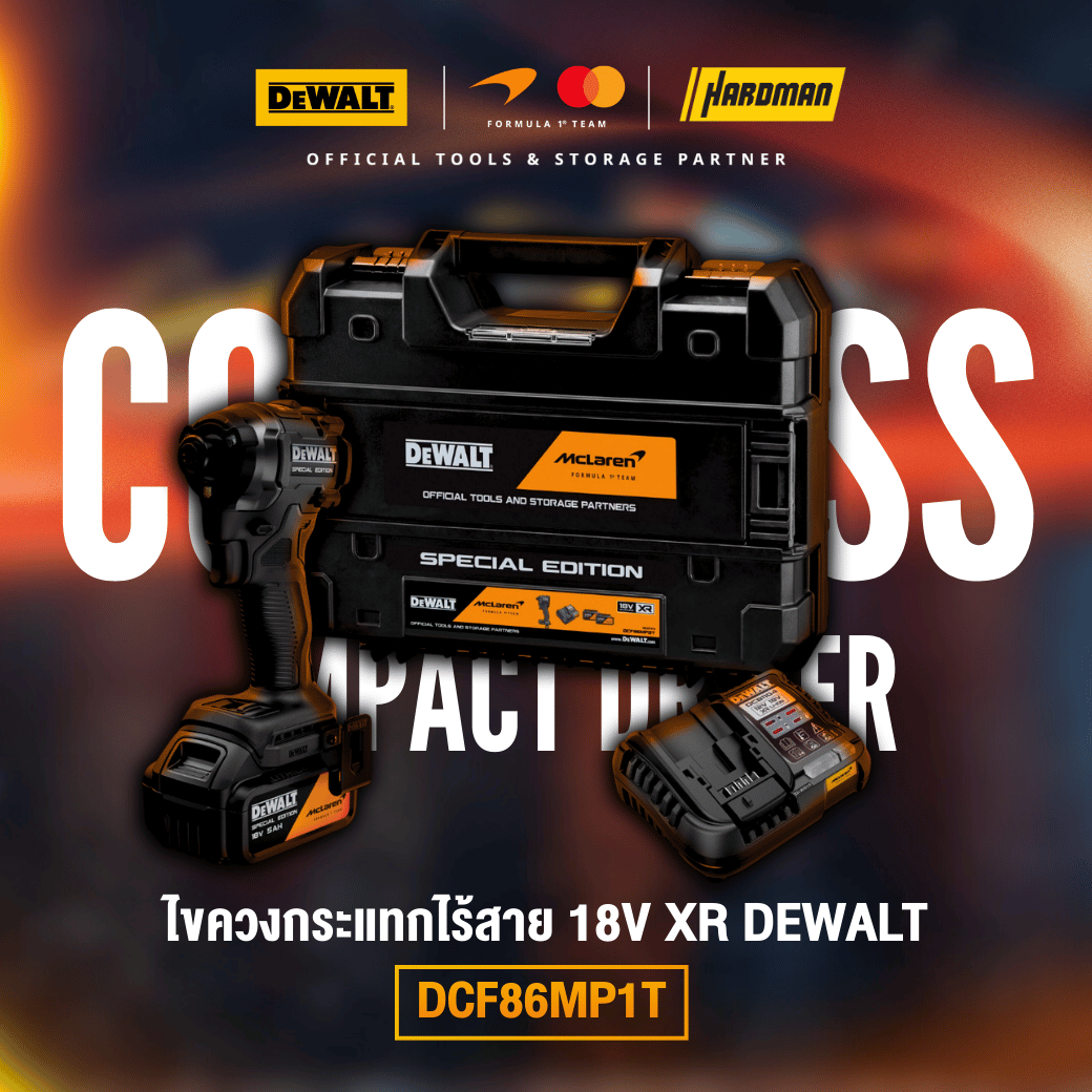 DEWALT x McLaren F1 Team Impact Wrench รุ่น DCF86MP1T-QW 18V 5Ah คือเครื่องมือที่สมบูรณ์แบบสำหรับมืออาชีพที่ต้องการพลังสูงสุดควบคู่กับดีไซน์ที่โดดเด่นไม่เหมือนใคร ผลิตในรุ่นพิเศษเพื่อเฉลิมฉลองความร่วมมือกับทีม McLaren F1 ผสานเทคโนโลยีขั้นสูงและดีไซน์สปอร์ตไว้ในเครื่องมือหนึ่งเดียว ด้วยแรงบิดในการขันสูงสุดถึง 205 นิวตันเมตร เหมาะอย่างยิ่งสำหรับงานหนักในสายยานยนต์ งานระบบโรงงาน และงานอุตสาหกรรม แบตเตอรี่ XR 18V 5Ah, มอเตอร์ Brushless และด้ามจับตามหลักสรีรศาสตร์ ช่วยมอบประสิทธิภาพที่เหนือกว่า ใช้งานได้นานขึ้น และให้ความสบายสูงสุดระหว่างการทำงาน