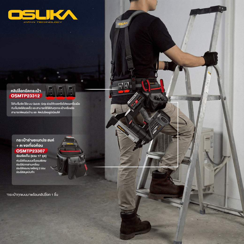 สายพยุงหลังสำหรับเข็มขัดช่าง OSUKA รุ่น OSMTP23313 ออกแบบมาเพื่อช่วยรองรับและกระจายน้ำหนักของอุปกรณ์ที่พกพาบนเข็มขัดช่าง ช่วยลดแรงกดทับบริเวณเอวและหลัง ทำให้สวมใส่สบายยิ่งขึ้นระหว่างการทำงาน สามารถปรับระดับสายให้กระชับกับสรีระของผู้ใช้งานได้ ช่วยเพิ่มความคล่องตัวและความมั่นคงขณะทำงาน เหมาะสำหรับช่างที่ต้องพกพาเครื่องมือหลายชิ้นและใช้งานต่อเนื่องเป็นเวลานาน ช่วยลดความเมื่อยล้าและเพิ่มประสิทธิภาพในการทำงาน.