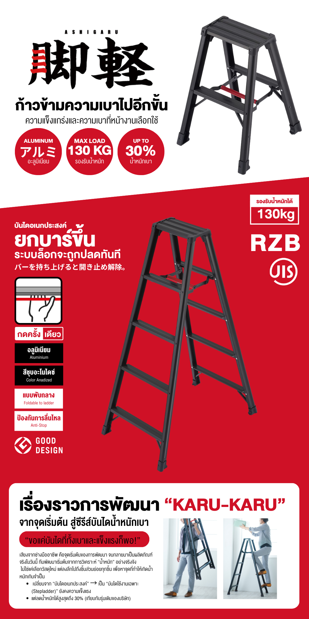 เป็นบันไดอะลูมิเนียมแบบพับสำหรับใช้งานเฉพาะ (Dedicated Stepladder) ในซีรีส์ Kyakugaru Black ซึ่งเป็นที่รู้จักในด้านความเบาเป็นพิเศษและดีไซน์สีดำที่ทันสมัย บันไดรุ่นนี้ออกแบบมาให้มีน้ำหนักเบากว่าบันไดทั่วไปถึง 30% โดยยังคงความแข็งแรงทนทานตามมาตรฐาน JIS เหมาะสำหรับการใช้งานทั่วไปในบ้าน ออฟฟิศ หรือร้านค้า ที่ต้องการความสูงเพิ่มขึ้นเล็กน้อย มาพร้อมกับ One-Touch Bar ที่ช่วยให้การพับเก็บทำได้อย่างง่ายดายด้วยมือเดียว และมีแผ่นรองเหยียบที่กว้างเพื่อความมั่นคงในการใช้งาน